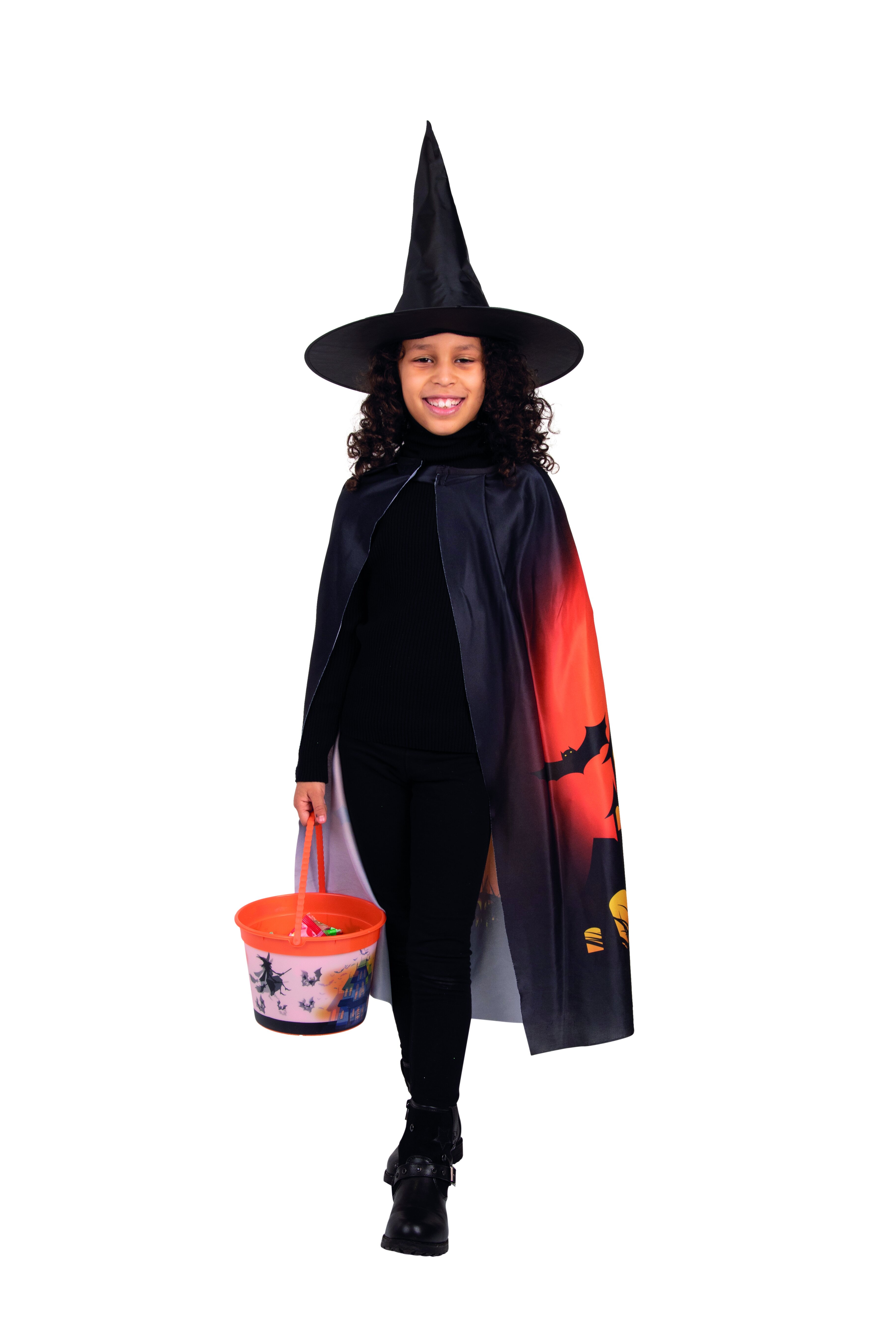 Ein 15 cm hoher Trick or Treat Halloween Eimer mit einem Durchmesser von ungefähr 21 cm mit Henkel. Der Eimer ist orange-weiß mit 3D Lenticular Halloween Wechselbildern wie Spukhaus, Hexe auf Besen und Fledermäusen verziert. Kann zum Einsammeln der Süßigkeiten verwendet werden oder auch als Deko für die Halloween Party.