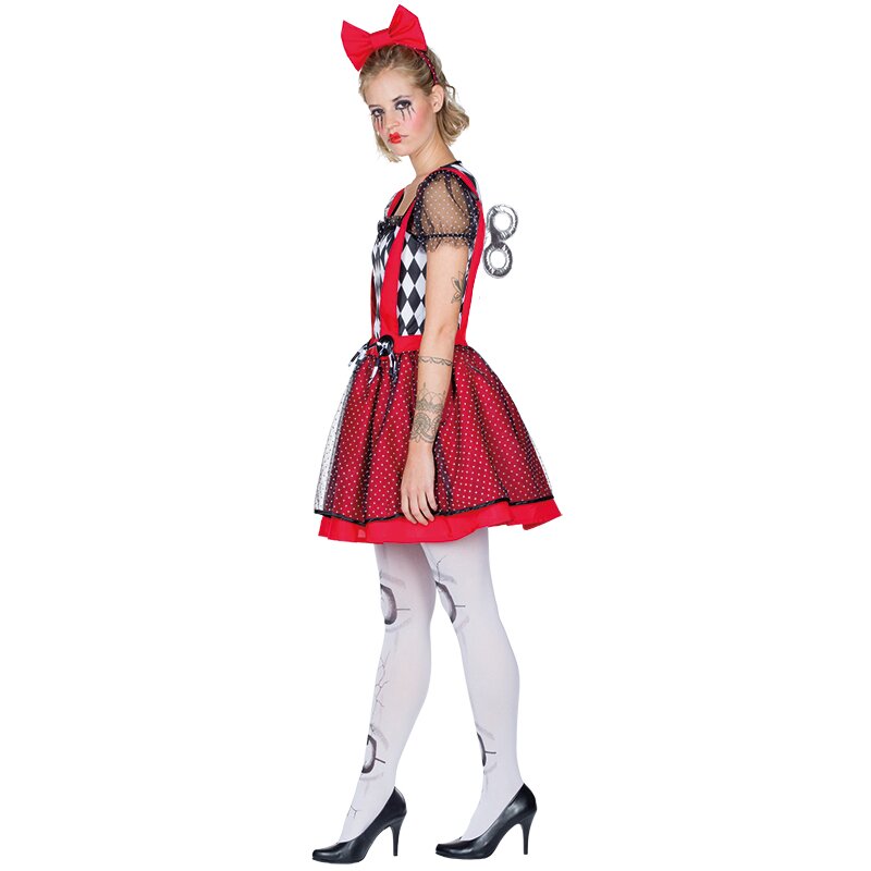 Kleid mit einem Oberteil aus schwarz-weißem Rautenmuster und einem roten Rock mit Trägern. Die kurzen Puffärmeln und der Überrock sind aus schwarzem Tüll mit weißen Punkten. Inklusive eines roten Haarreifs mit Tüllüberzug und einer großen Schleife. Auf dem Rücken ist eine silberne Drehschlüsselattrappe angebracht.