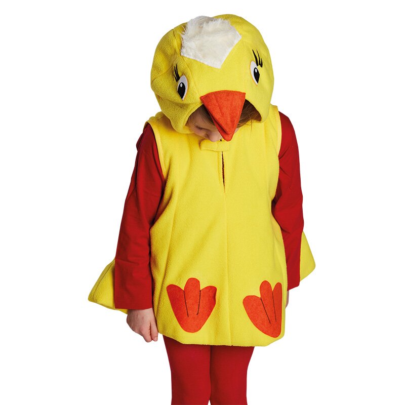 Bauschig geschnittenes Kapuzenoberteil aus einem quietschgelben Stoff. Auf der Vorderseite sind orangene Entenfüße appliziert. Die Kopfbedeckung ist mit Augen, einem Schnabel und einem Federflaum dekoriert.