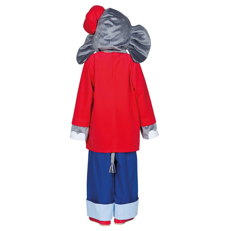 Benjamin Blümchen Deluxe-Kinderkostüm. Ein rotes Oberteil mit Ärmelaufschlagen, die wie Elefantenfüße gestaltet sind. Die blauen Hosen haben breite Hosenaufschläge. Die Kopfbedeckung aus grauem Pannesamt ist mit großen Elefantenohren, einem wattierten Rüssel und einer roten Mütze dekoriert.
