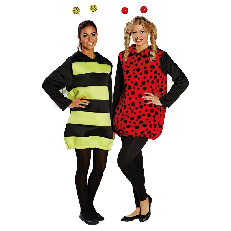 Bauschig geschnittenes Oberteil aus gelb-schwarz gestreiftem Stoff. Das Kostüm ist am Rücken mit kleinen Flügeln und einem Stachel dekoriert. Inklusive eines Haarreifs mit kugelförmigen Fühlern.