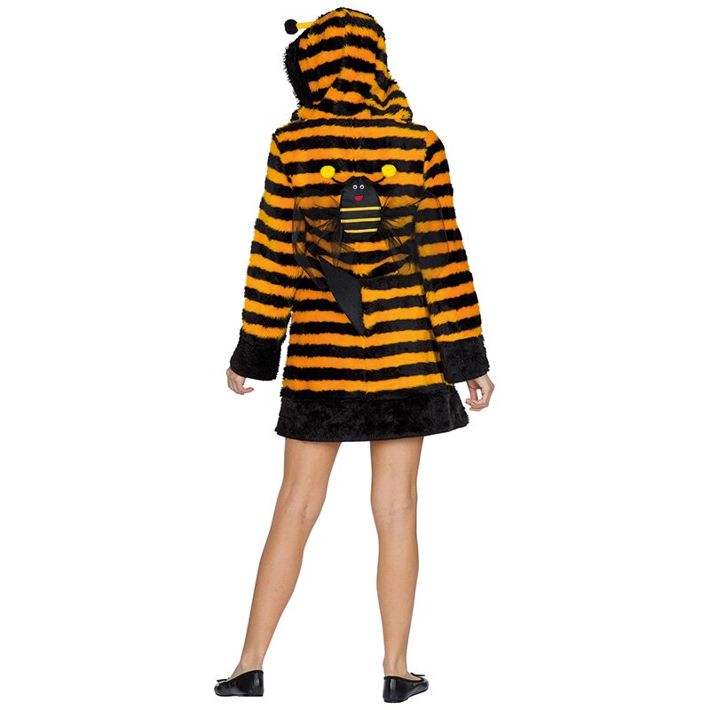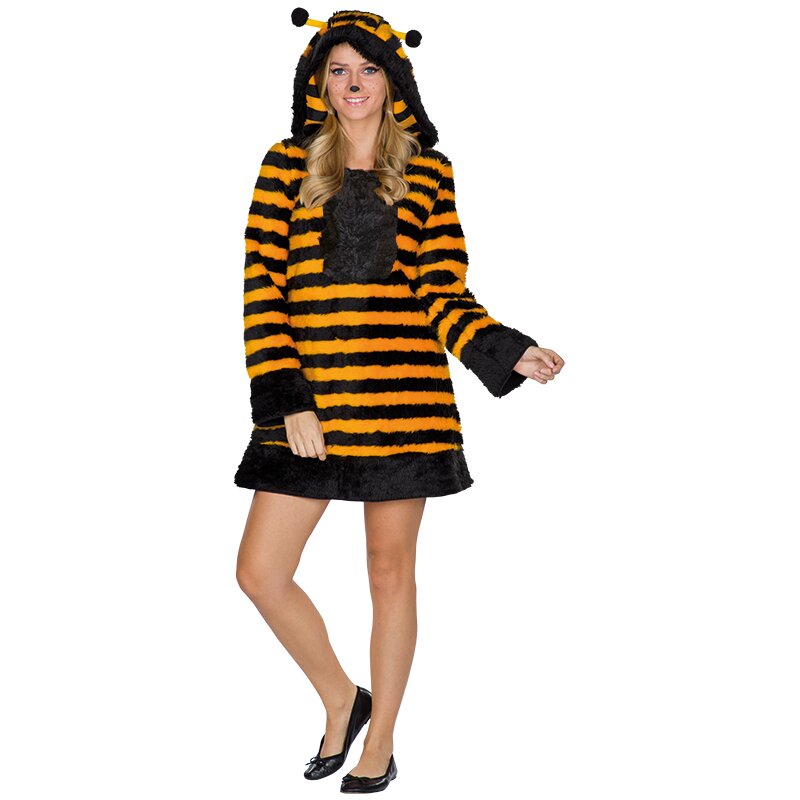 Kapuzenkleid aus weichem, gelb-schwarz gestreiften Plüsch. An der Kapuze sind Fühler mit Bommeln angenäht. Das Kleid ist an der Kapuze, auf der Brust und an den Säumen mit schwarzem Fell besetzt. An der Rücksete ist eine abnehmbare Bienenfigur mit schwarzen Tüllflügeln befestigt.