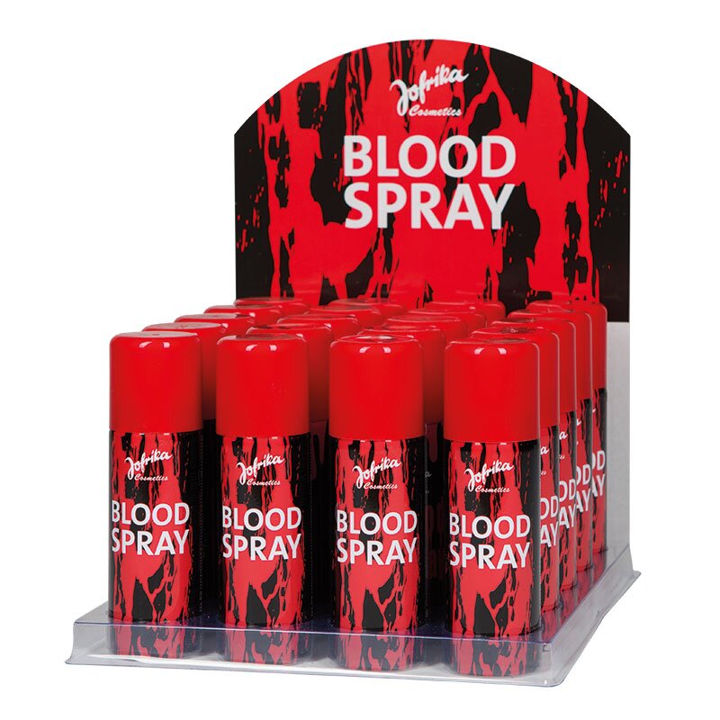 20 er Display Theaterblut (Artikel 708505) zum Aufsprühen, mit dem Blutspritzer-Effekte hergestellt werden können. Für Haut und Textilien geeignet.