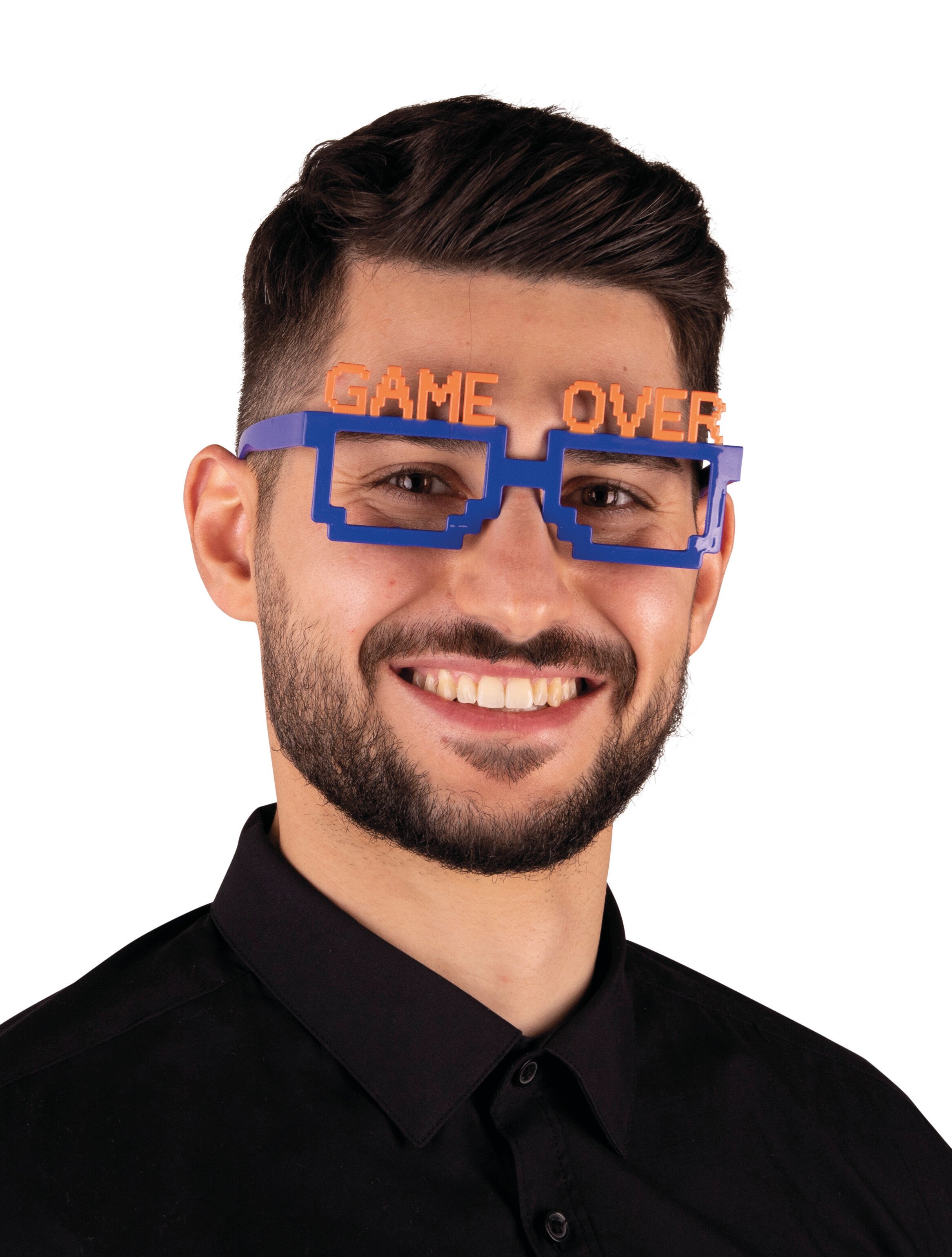 Eine blaue Spaßbrille ohne Gläser, mit GAME OVER Schriftzug. Passend als lustiges Accessoire für Kostümkreationen, Junggesellen- und Junggesellinnenabschied, Mottoparty etc.
