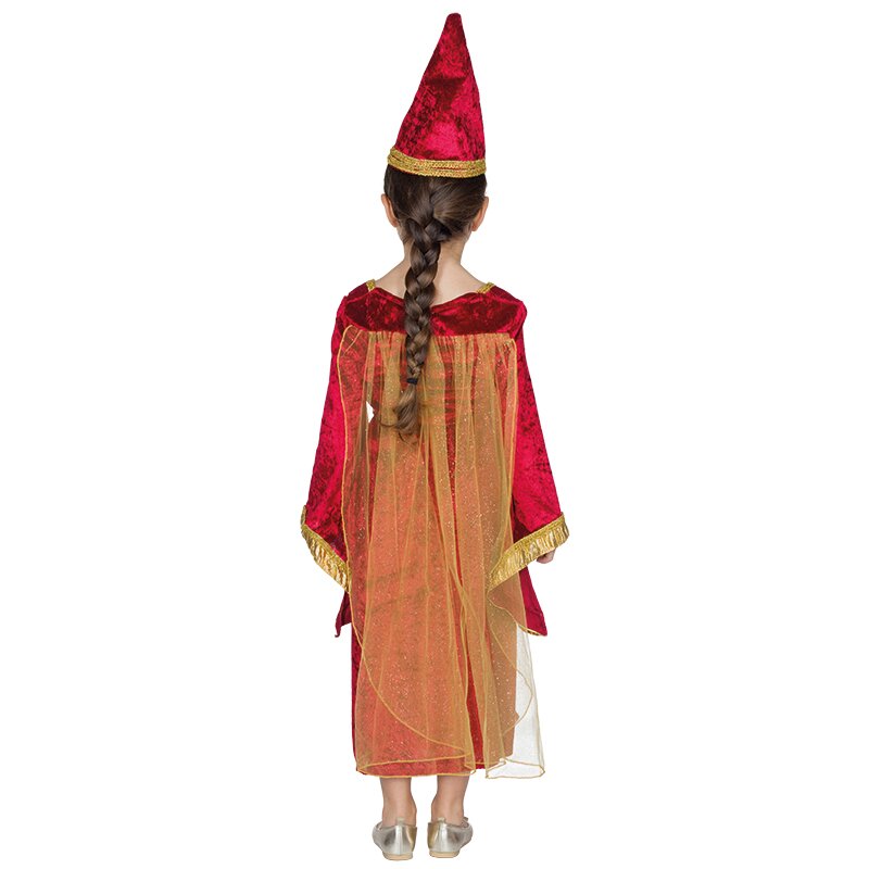 Burgfräulein-Kleid aus weinrotem Pannesamt mit weiten Trompetenärmeln. Das Kleid ist entlang der Vorderseite und der Ärmelsäume mit goldenem Stoff und Zierborte besetzt. Auf der Rückseite ist ein Cape aus transparentem Glitzertüll angenäht. Inklusive eines passenden Spitzhutes, der mit Borte und einem Schmuckstein dekoriert ist.