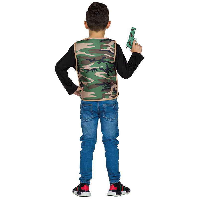 Weste in einem Camouflagemuster, auf deren Brust Militärembleme aufgestickt sind. Inklusive einer Spielpistole mit einem Stoffhalfter, der mittels Klettverschluss an der Weste befestigt werden kann.