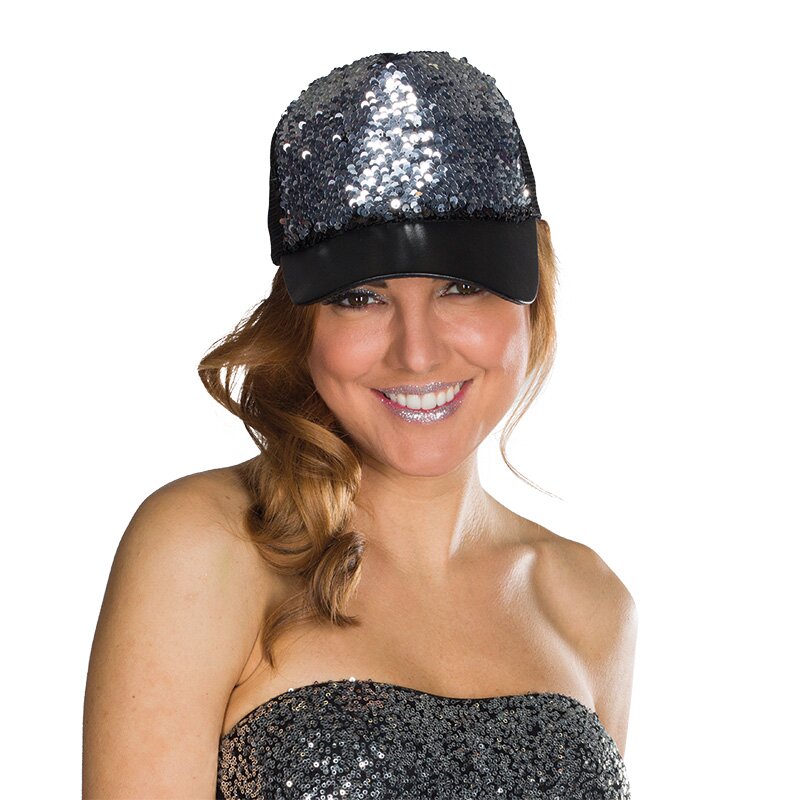 Schirmkappe, die vorne mit schwarzen Pailletten besetzt ist. Indem man über die Pailletten streicht, wechselt die Farbe von Schwarz zu Silber.