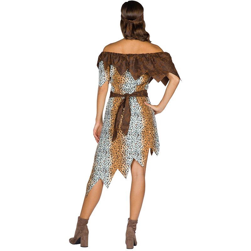 Schulterfreies Fleecekleid im Leopardenmuster mit passendem Stirnband. Der gezackte Kragen, der festgenähte Gürtel und der an der Taille befestigte Beutel mit Kordelzug sind in brauner Lederoptik gehalten. Die Säume der kurzen Ärmel und des seitlich abfallenden Rocks sind stark gezackt.
