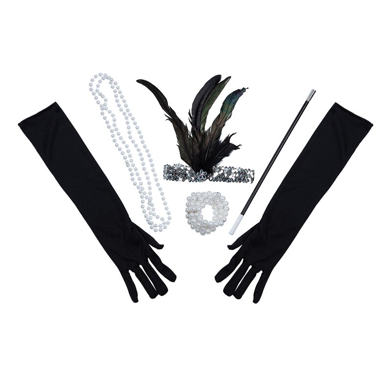 5teiliges Charleston-Accessoires-Set für Damen. Beinhaltet ein Halsband und Armband aus Perlen, lange schwarze Handschuhe, ein Stirnband aus silbernen Pailletten, das mit schwarzen Federn geschmückt ist und eine lange schwarze Zigarettenspitze.