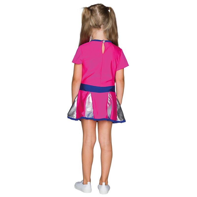 Kurzärmliges pinkes Minikleid mit silbernen Einsätzen, blauer Borte und Aufdrucken im Cheerleader-Design.