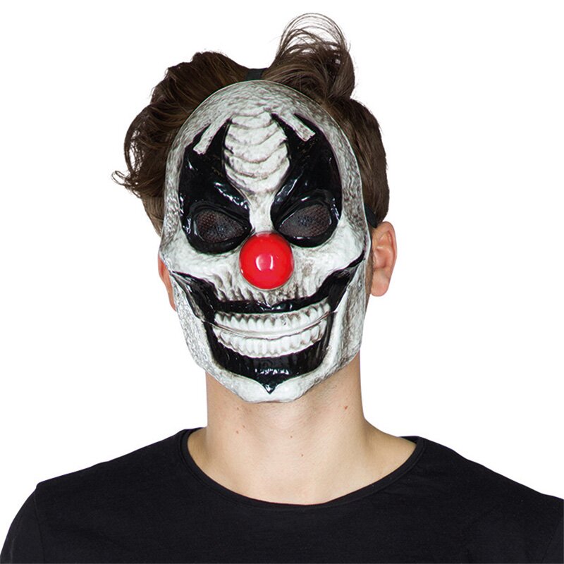 Weiße Horror-Clown-Maske mit schwarz gefärbten Lippen und Augenpartien, sowie einer roten Clownsnase. Der Kiefer des Mundes ist beweglich.