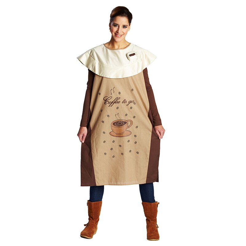 Knielange Robe in Form eines Kaffeebechers mit einem Becherdeckel-Kragen und einem Aufdruck auf der Vorderseite.