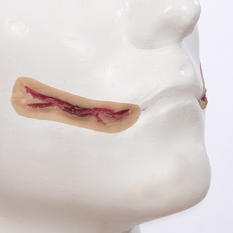 Künstliche Verletzungen aus Naturlatex. Die Wunden können nach den Angaben auf der Packung auf die gewünschten Hautstellen aufgetragen werden und sind wiederverwendbar. Inklusive eines Hautklebers. Von professionellen Maskenbildnern entwickelt.