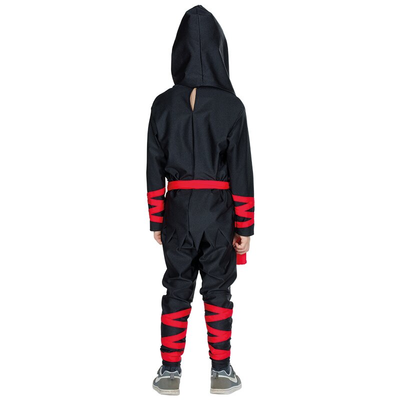 Schwarzer Ninja-Anzug bestehend aus Oberteil und Hose, die an den Ärmeln und Beinen mit weißen Knochen und roten Bandagen bedruckt sind. Auf der Vorderseite ist ein geformter, blutverschmierter Brustkorb angebracht. Inklusive eines breiten roten Stoffgürtels und einer schwarzen Kapuze mit rotem Mundschutz.