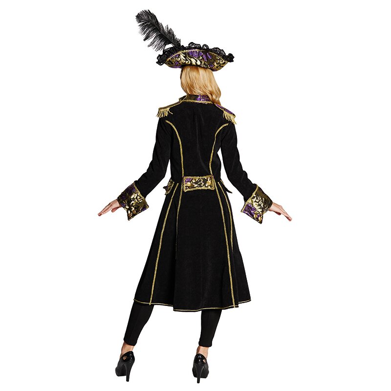 Tailliert geschnittener, schwarzer Piratenmantel, der mit Epauletten, goldenen Knöpfen und einer Goldborte entlang des Saums geschmückt ist. Die eingenähte Weste, die Taschenklappen, der Zierriegel am Rücken und die breiten Ärmelaufschläge sind aus einem lila-goldenen Stoff in Brokatoptik.