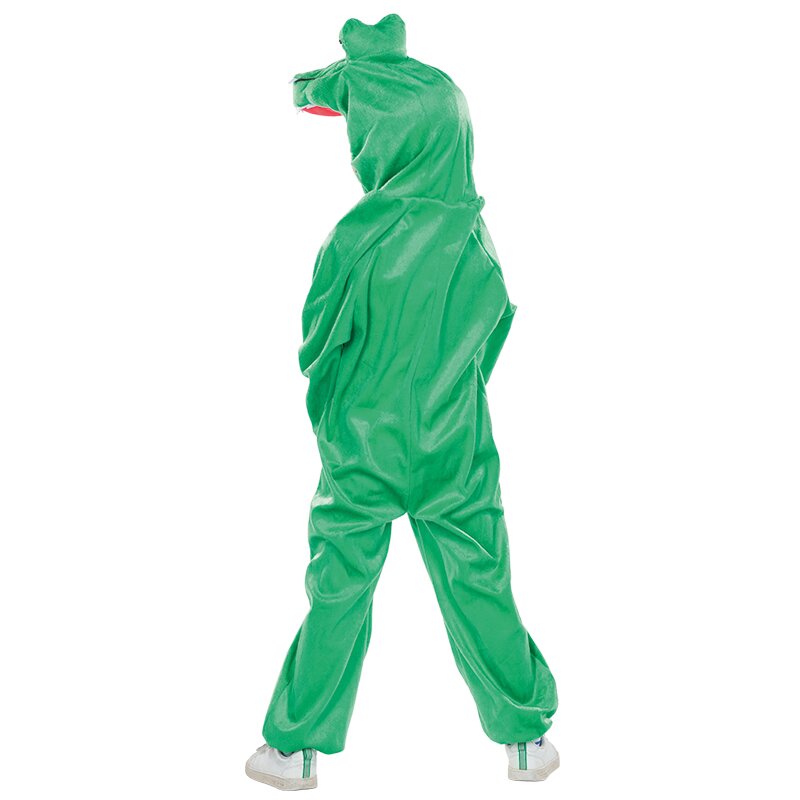 Grüner Kapuzenoverall mit einem weißen Einsatz auf der Vorderseite. An der Kapuze ist ein Drachenkopf mit ausgepolsterter Schnauze, großen Augen und einer Zahnreihe befestigt.