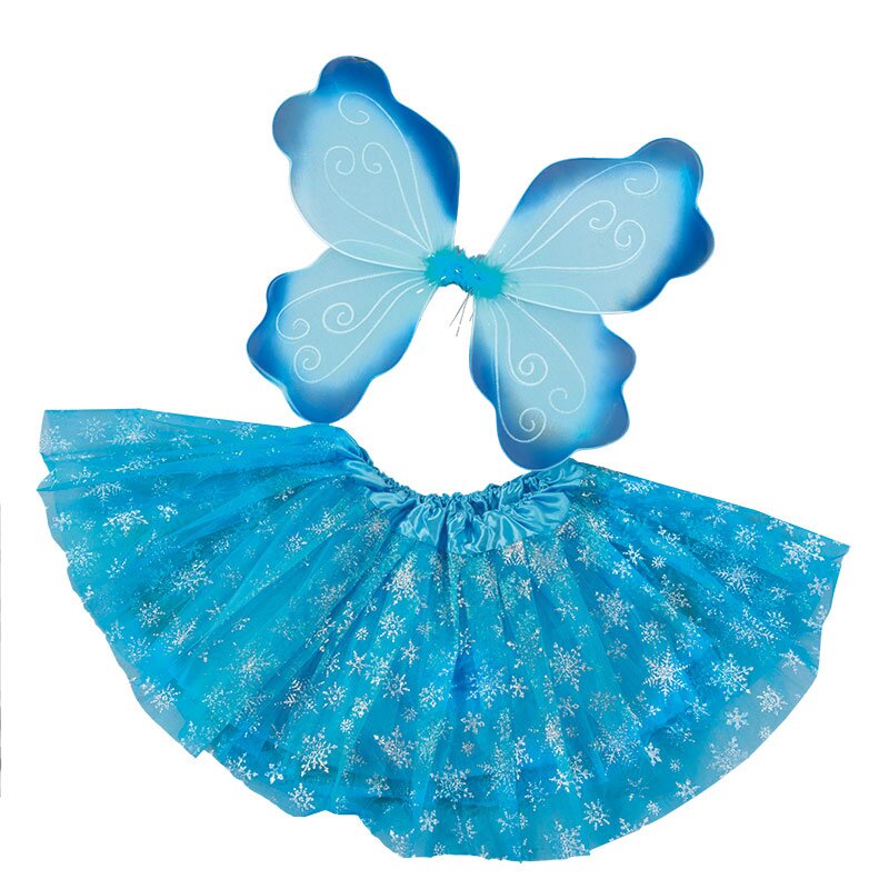 Kurzes blaues Tutu, dessen Tüllüberrock mit glitzernden, silbernen Eiskristallen bedruckt ist. Inklusive Flügeln zum Umbinden.