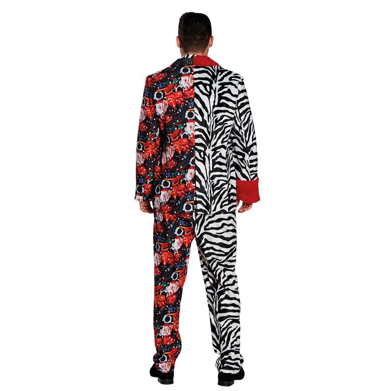 Zweiteiliger Herrenanzug bestehend aus Jacket und Hose. Einen Seite ist in schwarz-weißem Zebramuster gehalten, mit einem Revers und Ärmelaufschlag aus rotem Plüsch. Die zweite Seite ist mit einem Phantasiemuster bedruckt und am Revers mit schwarzen Pailletten besetzt. Inklusive einer passenden Krawatte.