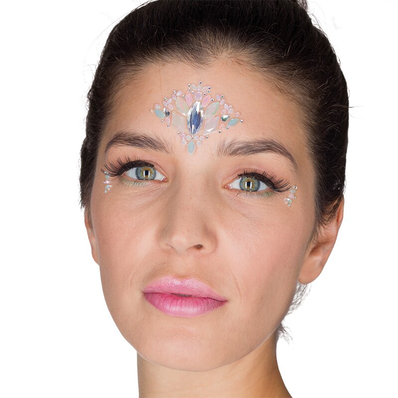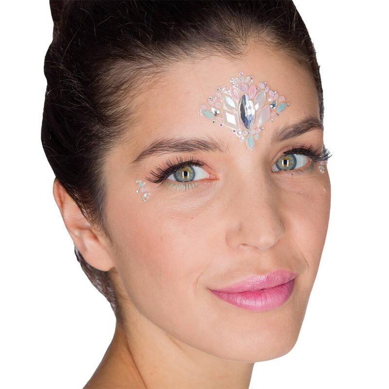 Dekorativer Stirn- und Gesichtsschmuck, der aus selbstklebenden Schmucksteinen geformt ist.