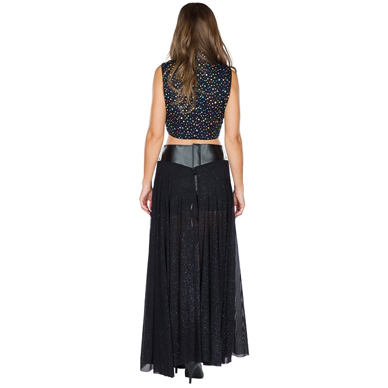 Langer Rock aus schwarzem Glitzertüll, der vorne geöffnet ist. An der Taille ein Korsagengürtel in schwarzer Lederoptik angenäht.