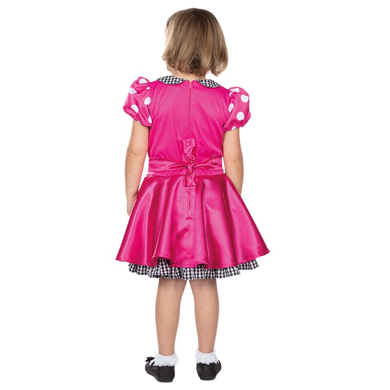 Pinkfarbenes Kleid im Stil der 50er Jahre. Das Oberteil und die kurzen Puffärmel sind mit großen weißen Punkten bedruckt. Der Rundkragen, das Taillenband und der Saum des Unterrocks sind aus einem weiß-schwarz karierten Stoff gefertigt. Auf dem Rock ist ein Pudel aufgedruckt, dessen Leine aus Pailletten sich über den Rock schlängelt. Eine pinke Schleife ist als Deko angebracht.
