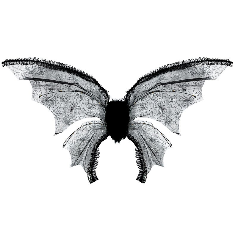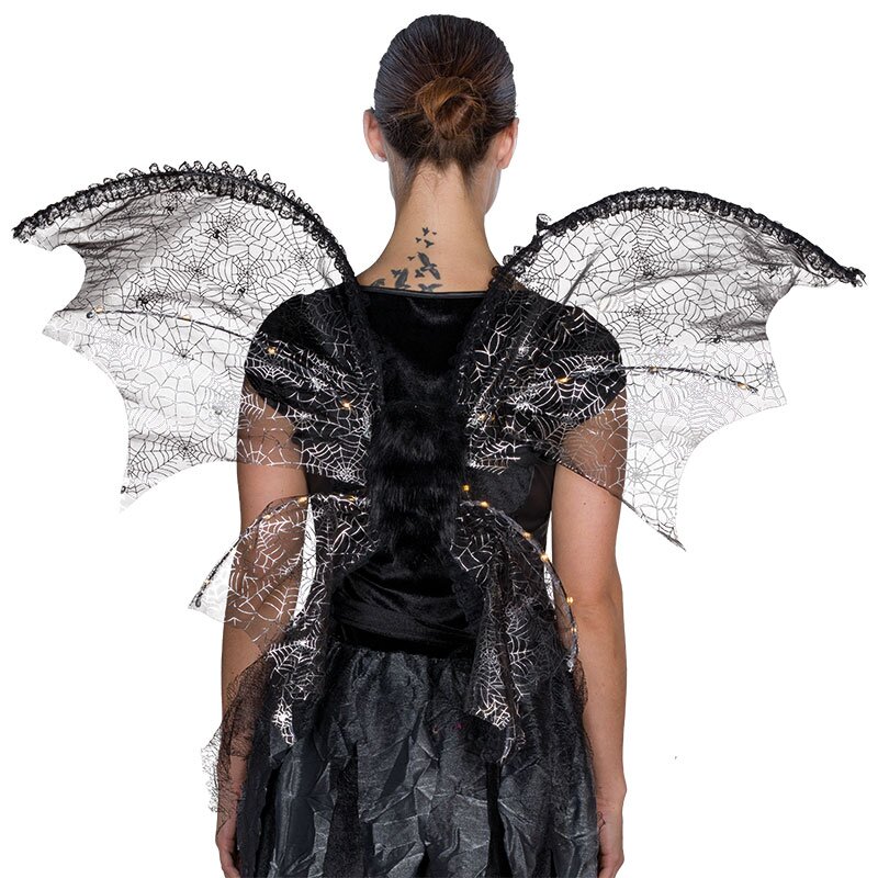 Große schwarze Fledermausflügel, die mit einem silbernen Spinnenwebenmuster bedruckt sind. Die Mitte ist mit schwarzem Plüsch besetzt.