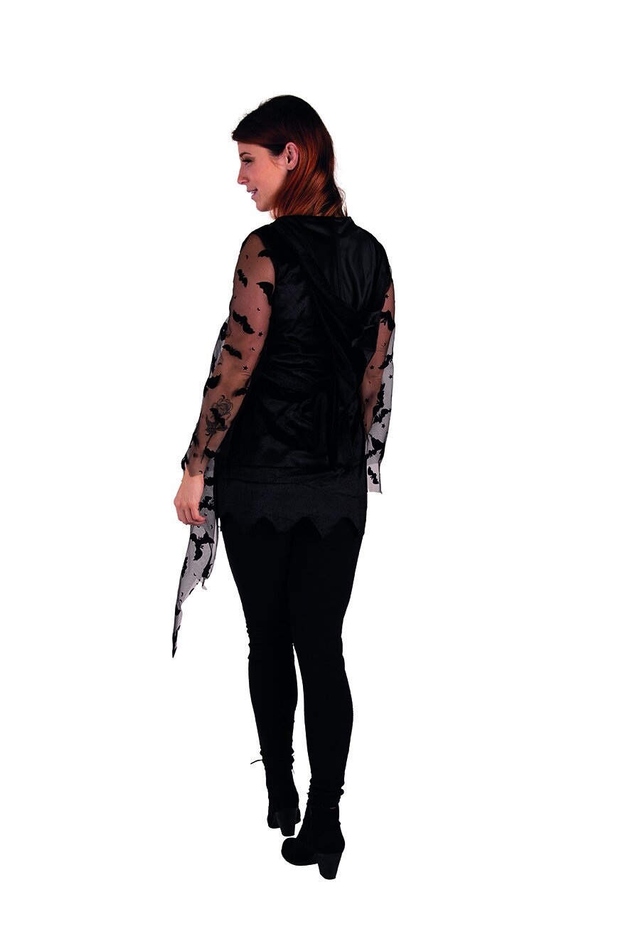 Schwarze Tunika für Damen aus Pannesamt mit Kapuze und nach unten weit auslaufenden, transparenten Ärmeln, die mit Flädermäusen unterschiedlicher Größe beflockt wurden. Das Kleid hat eine Zierschnürung vorn, an deren Bandenden Fledermäuse befestigt sind. Seitlich ist ein Bindegürtel angebracht, der untere Abschluss ist in Zackenform ausgeführt.