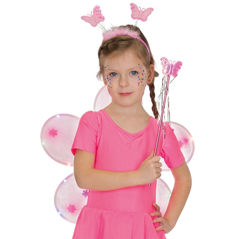 Transparente Flügel in Blütenform, die mit bunten Blüten dekoriert sind. Durch den Rand der Flügel läuft ein Schlauch mit LED-Lichtern. Am glänzenden Stab und dem Haarreif sind pinkschillernde Schmetterlinge befestigt. Batterien sind beinhaltet.