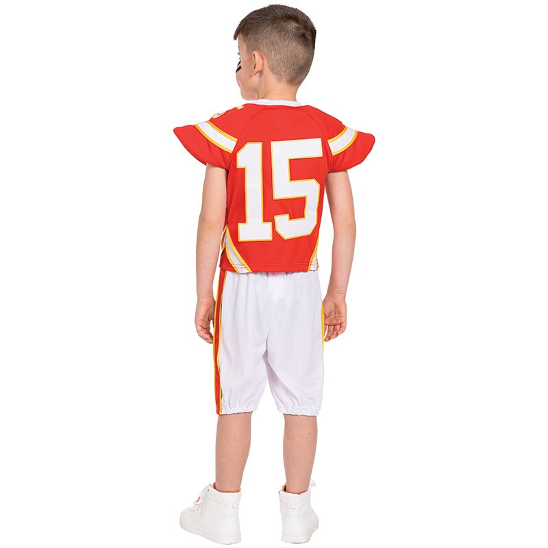 American Football Uniform, bestehend aus einem kurzärmligen Oberteil und einer halblangen Hose. Das rote Shirt hat gepolsterte Schultern, und auf der Vorder- und Rückseite sind Spielernummern aufgedruckt. Die weiße Hose ist an den Knien und Oberschenkeln gepolstert.