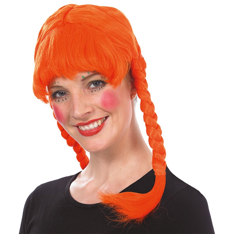 Eine orangefarbene Perücke mit Pony und schulterlangen Haaren, die auf beiden Seiten zu einem Zopf geflochten sind.