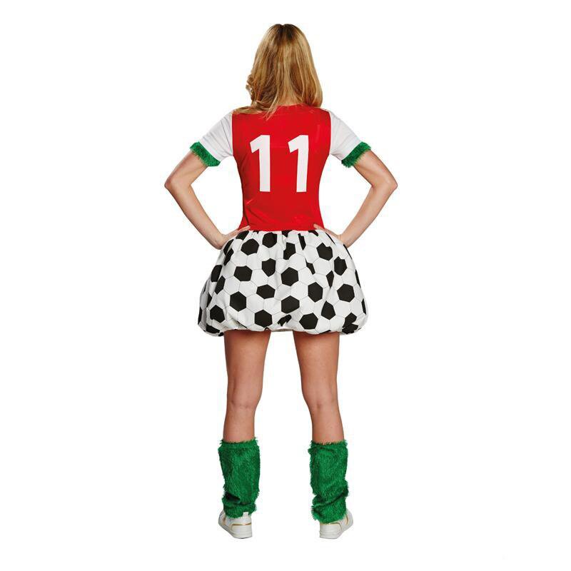 Kurzärmliges Ballonkleid mit einem roten Oberteil, weißen Ärmeln und einem Rock im Fußballmuster. Am Kragen und Ärmelenden ist ein grüner Stoff in Grasoptik angebracht und ein kleines Karnevalsemblem dekoriert die linke Brustseite und auf dem Rücken strahlt eine weiße 11. Dazu gibt es grüne Stulpen aus dem Stoff mit Grasoptik.