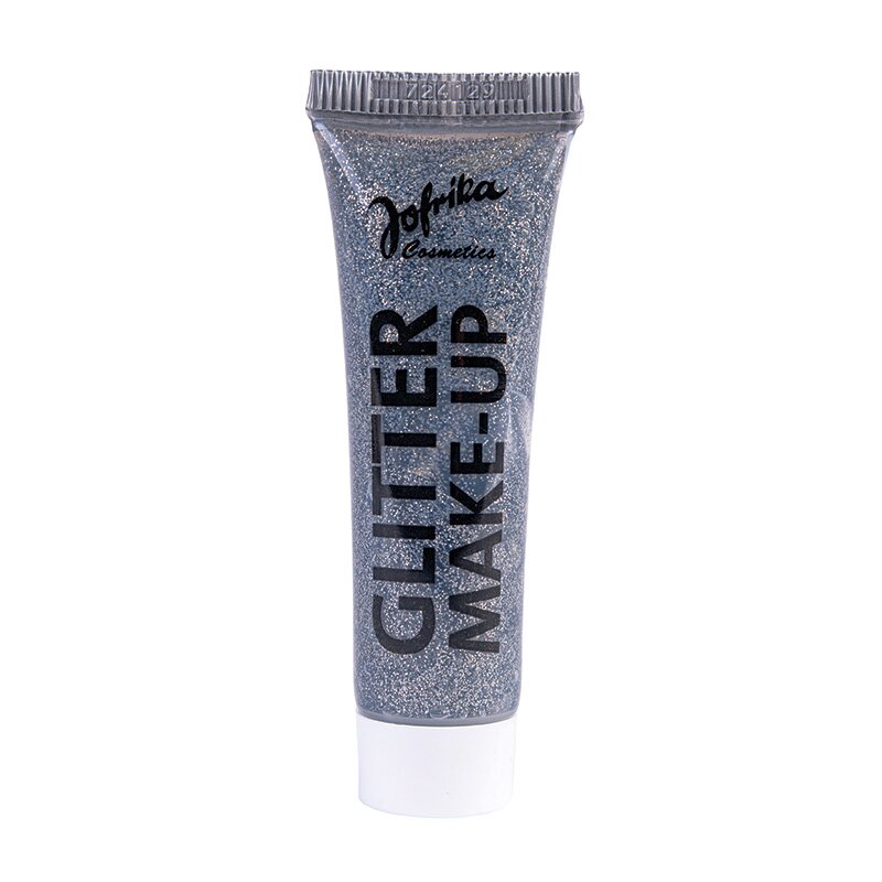Für glamouröse Glittereffekte wird das silberne Glitter Make-up mit einem Schwämmchen oder einfach mit den Fingern aufgetragen. Lässt sich mit Wasser und Seife wieder entfernen.