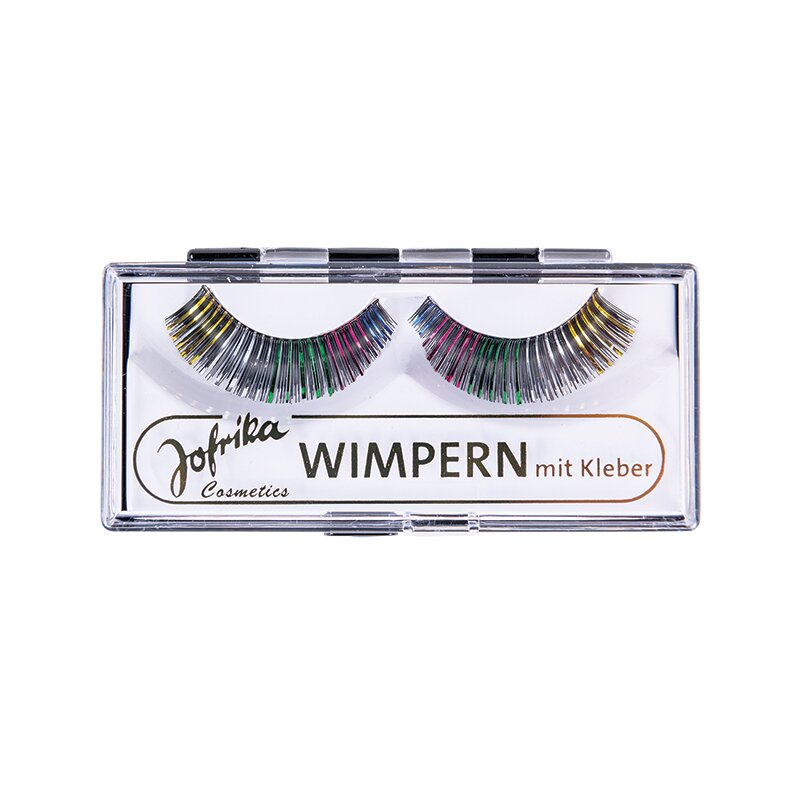 Künstliche Wimpern mit einem glänzenden regenbogenfarbenen Glittereffekt. Inklusive des Wimpernklebers.