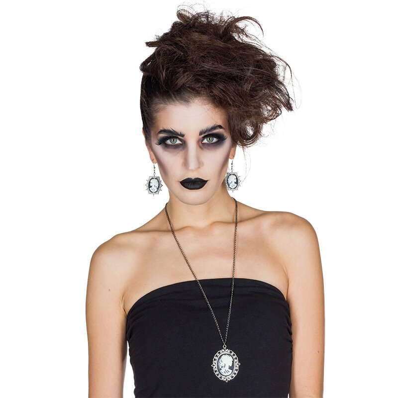 Ohrhänger mit dem Cameo eines weiblichen Skelettkopfs. Die Ohrringe haben eine aufwendige Fassung.