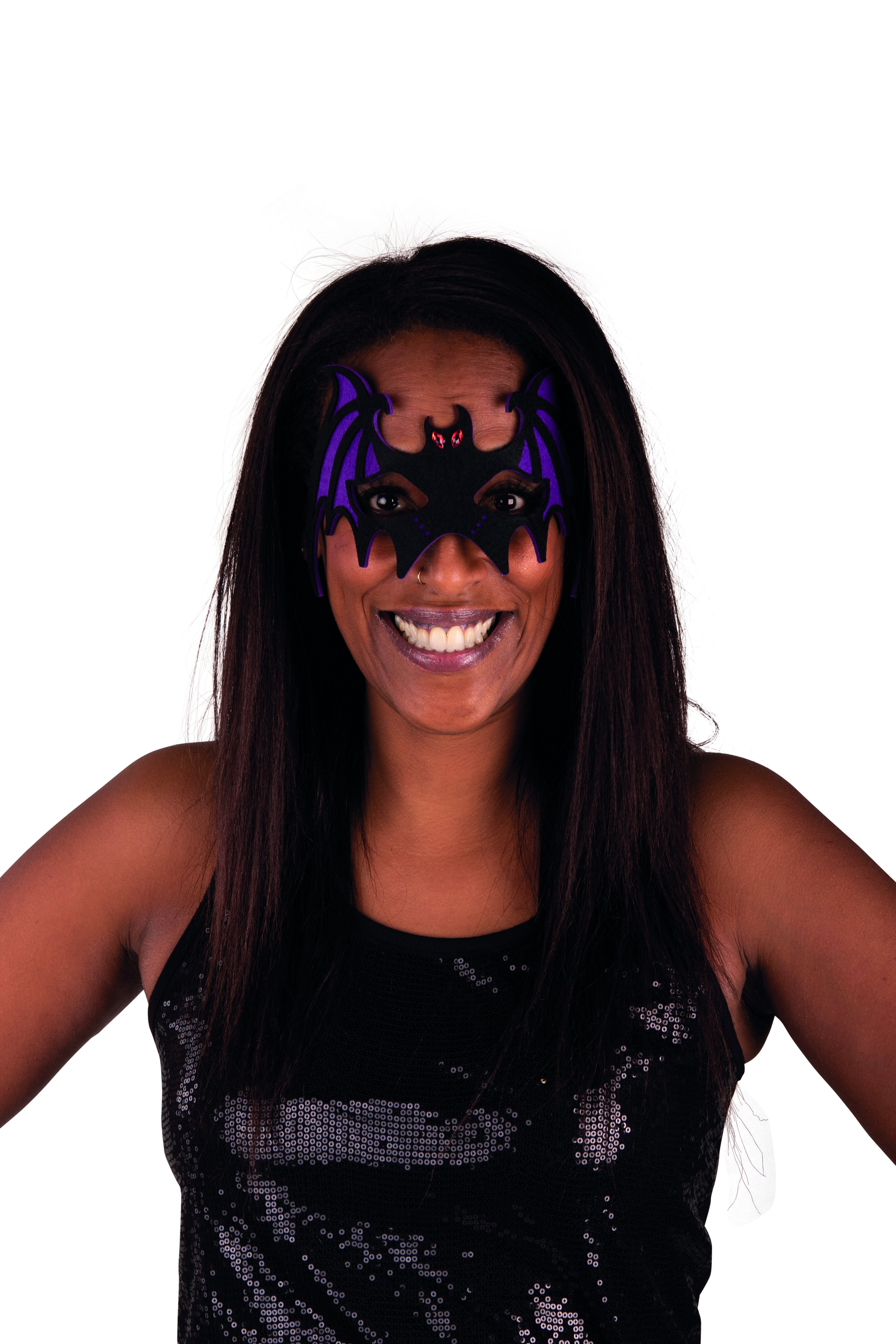 Fledermausmaske aus schwarzem und lilafarbenem Filz und einem schwarzen Gummiband. Zwei rote Schmucksteinchen symbolisieren die Augen der Fledermaus. Die Maske ist eine tolle Ergänzung zu unseren schwarzen Capes.