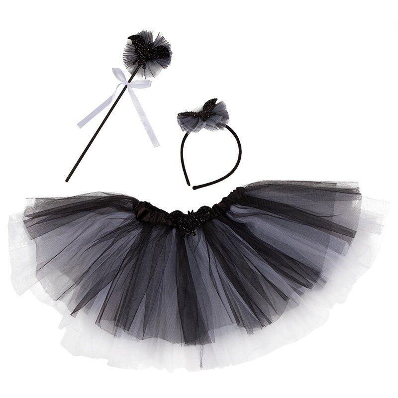Dreiteiliges Halloween-Set zum Verkleiden. Der Tüllrock besteht aus einer Lage weißem und einer Lager schwarzem Tüll. Inklusive eines Haarreifs mit einer Tüllschleife und eines schwarzen Stabs. Die Taille des Rocks, der Haarreif und der Stab sind mit glitzernden Fledermäusen verziert.