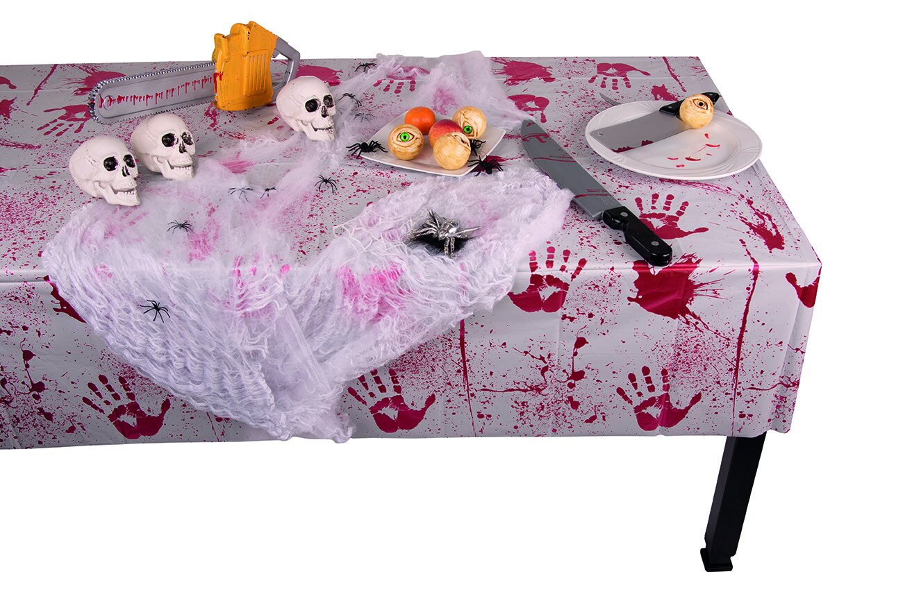 Eine Partytischdecke aus Polyethylen in weiß mit blutverschmierten Handabdrücken und Blutspritzern. Die Tischdecke ist ein gruseliger Effekt für jede Halloweenparty.