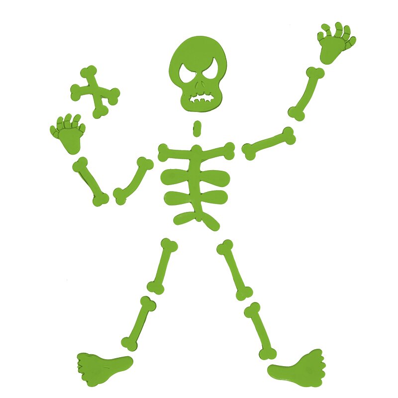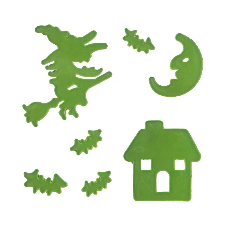 Gel-Sticker, die von selbst an glatten Oberflächen haften und im Dunkeln leuchten. Set beinhaltet verschiedene Halloween-Motive: Skelette, Geister und Hexen.