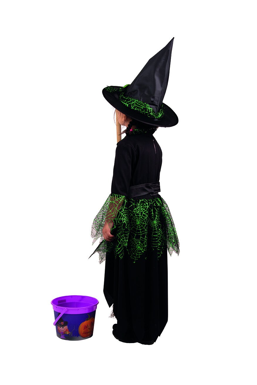 Langes schwarzes Hexenkleid für Kinder mit Tüllbesatz an Ärmeln, Kragen und Rock. Der schwarze Tüll ist mit grün-glitzernden Spinnweben bedruckt. Dazu passend ist links am Oberteil eine grüne Glitzerspinne aufgenäht und eine grüne Zier-Gürtelschnalle ausgewählt. Der Gürtel wird hinten mit Klett verschlossen, wie auch der Kragen im Nackenbereich einen Klettpunkt hat. Ein hoher schwarzer Hexenhut mit perfekt zum Kleid abgestimmtem Hutband ist inklusive.