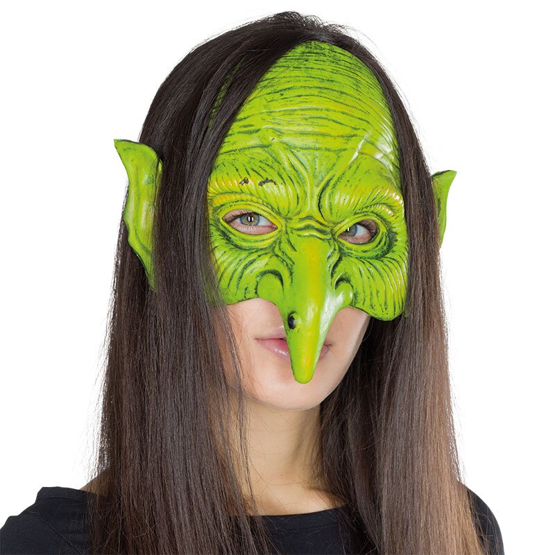 Grüne Hexenmaske aus weichem Kunststoff. Die Halbmaske hat viele Falten, eine lange Hexennase mit Warze und spitze Ohren.