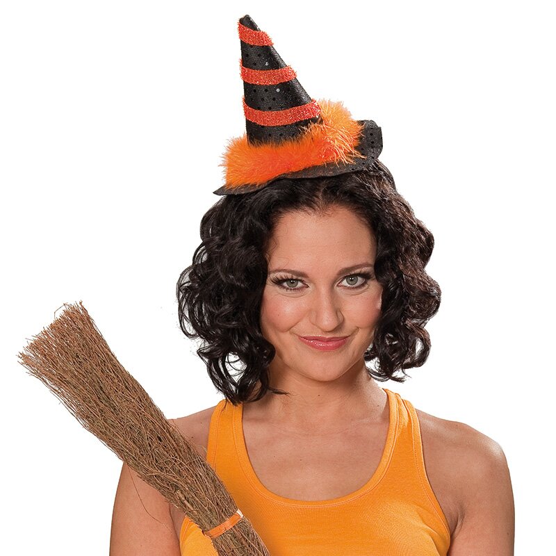 Haarreif mit einem Hexenhut aus glänzendem, paillettenbesetzten Stoff. Auf der Krempe ist Marabu angebracht; um die Hutspitze ist spiralförmig ein Band gewickelt.