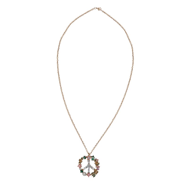 Halskette mit einem Peace-Zeichen, das mit Strasssteinen und kleinen Blüten aus bunten Schmucksteinen besetzt ist.