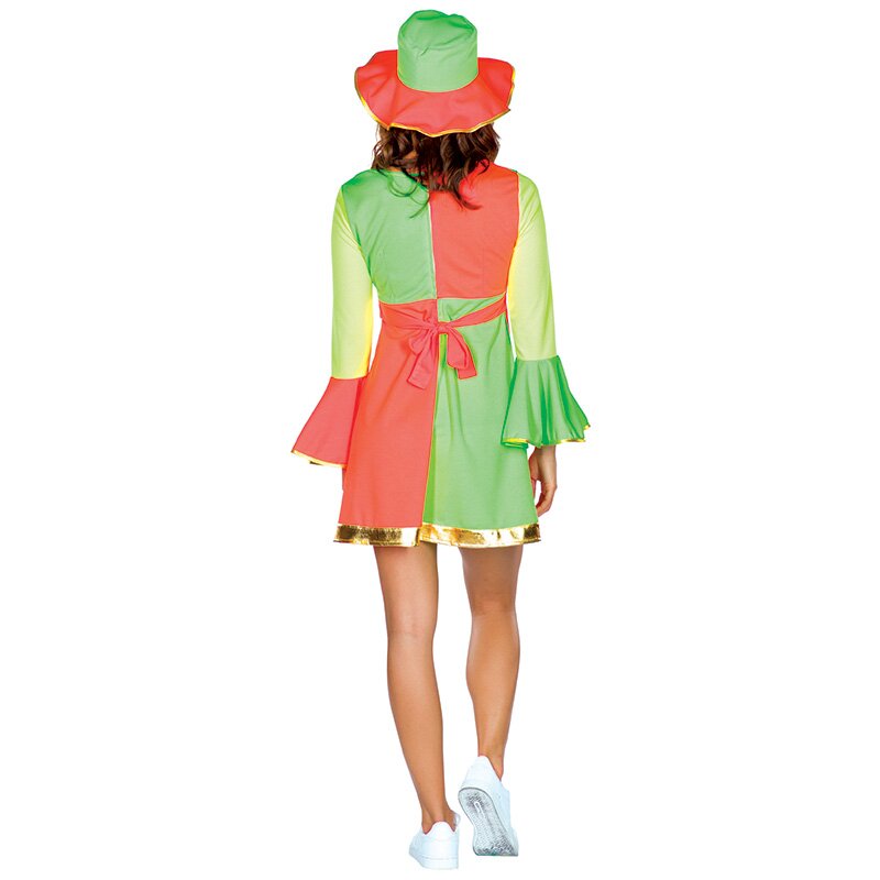 Hippie-Minikleid in leuchtenden Neonfarben mit langen Volantärmeln. Das Kleid ist am Kragen, der Taille und an den Säumen mit goldener Borte besetzt. Eine Hälfte des Oberteils sowie eine große Dekoblüte sind mit Pailletten besetzt. Inklusive eines passenden Hutes.