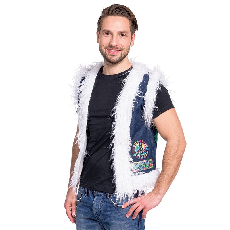 Dunkelblaue Jeansweste mit einer Borte aus weißem Zottelplüsch. Die Weste ist mit bunten Motiven im Hippie-Design verziert.