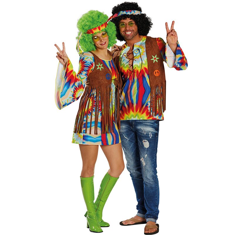 Hippie-Oberteil in einem Batik-Muster. Das Hemd hat ausladende Ärmel und eine Schnürung auf der Vorderseite. Die dunkelbraune Weste in Wildlederoptik hat eine lange Fransenborte und ist mit Hippie-Motiven verziert. Inklusive eines passenden Stirnbands.