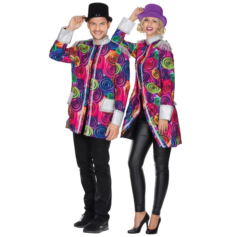 Bunte Jacke für Damen mit Reißverschluss vorne. Unter der silbernen Bordüre links und rechts des Reißverschlusses ist eine LED Lichterkette eingearbeitet. 3 x AA Batterien 1,5 Volt notwendig. Batterien nicht im Lieferumfang enthalten. Dazu passend ist unser Herrenartikel #119226.