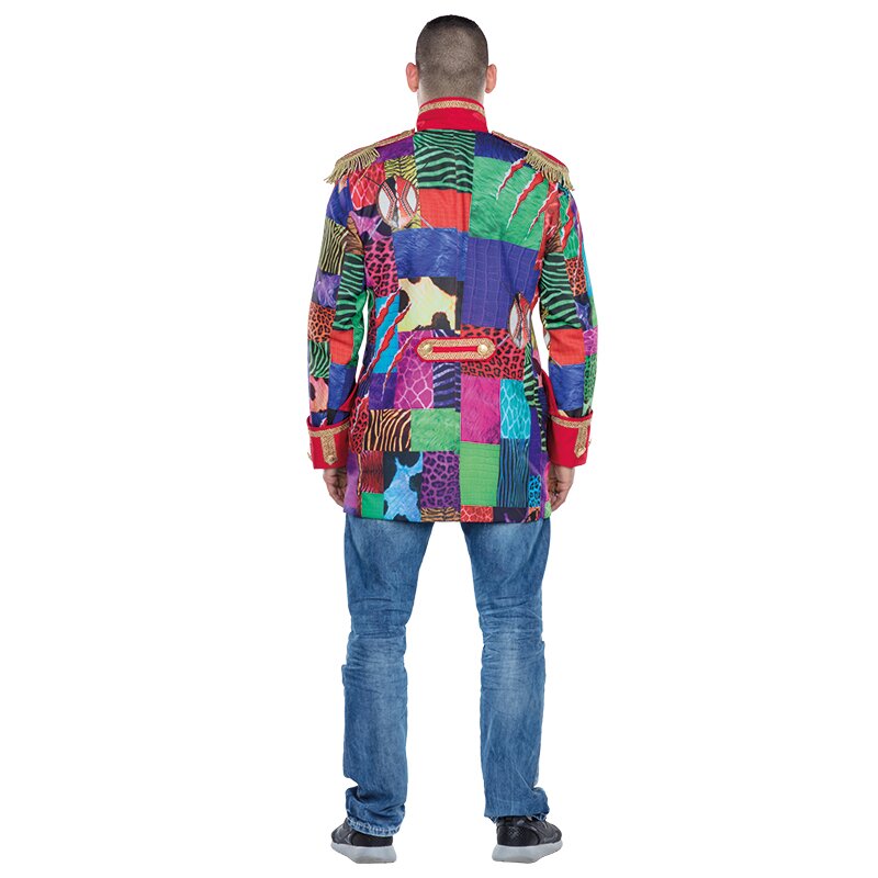 Herrenjacke aus Flicken in den unterschiedlichsten Mustern und Farben. Das Revers, die Taschenklappen und die Ärmelaufschläge sind aus rotem Stoff, der mit goldener Borte und Knöpfen verziert ist. Auf den Schultern sind Epauletten und am Rücken ein Zierriegel angebracht.