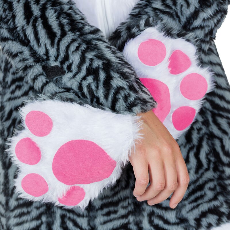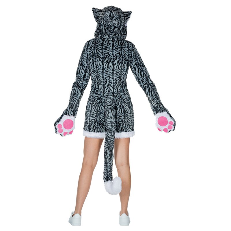 Langärmliges Kapuzen-Minikleid mit grau-getigertem Muster. Das Kleid ist am Kopf mit Ohren und auf der Rückseite mit einem langen Schwanz verziert. Die Säume an Kapuze und Rock sind mit weißer Fellborte besetzt. Ein langer Reißverschluss auf der Vorderseite ermöglicht ein bequemes An- und Ausziehen. Beinhaltet ein Paar Fäustlinge mit aufgenähten Pfotenabdrücken, die mit Klettverschluss am Ärmel befestigt werden können.