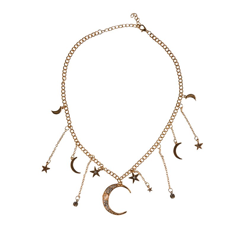 Goldfarbene Halskette, von der kleine Halbmonde und Sterne herabbaumeln, die mit Schmucksteinen verziert sind. An der Mitte ist ein großer, mit Schmucksteinen besetzter Halbmond angebracht.