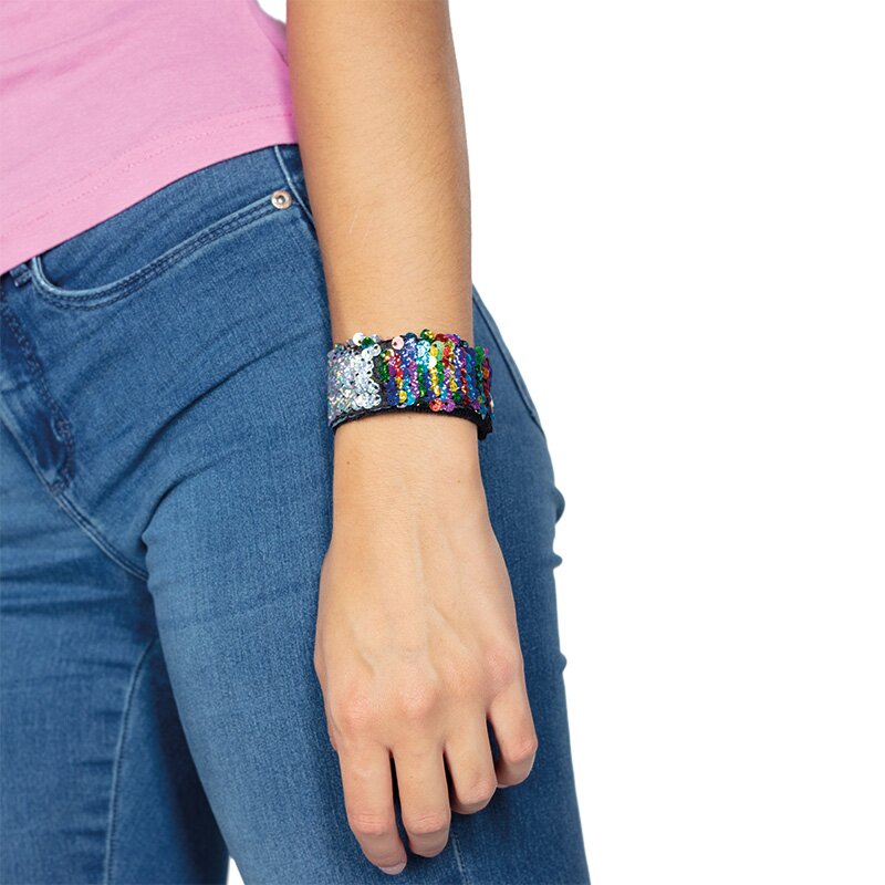 Paillettenbesetztes regenbogenfarbenes Armband, das sich bei leichtem Anschlagen um das Handgelenk wickelt. Indem man über die Pailletten streicht, wechselt die Farbe von regenbogenfarben zu schillernd.
